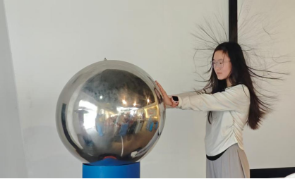 “怒发冲冠”静电体验区笑声不断。孩子们勇敢地站上绝缘台,手扶静电发生球,随着电荷不断累积,头发纷纷直立飞扬,现场惊呼与欢笑此起彼伏。