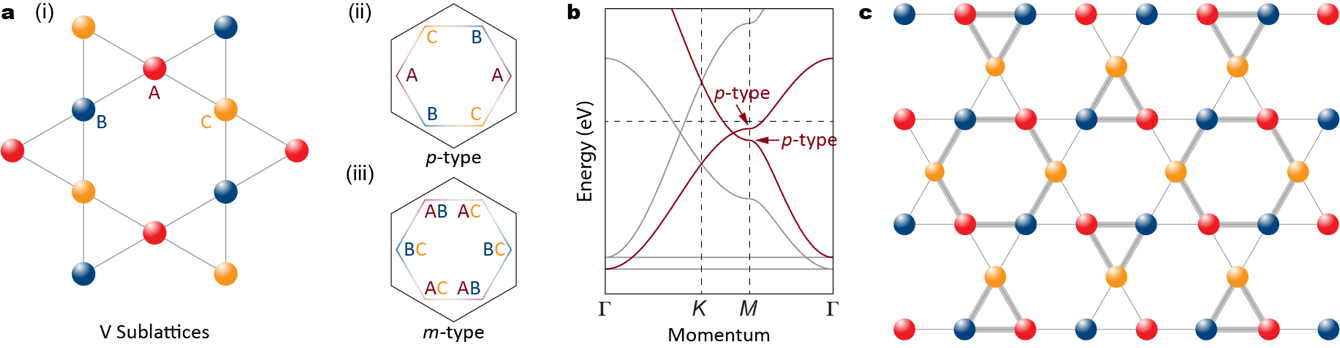 2.首次在整个AV₃Sb₅家族中清晰识别多个靠近费米能级的“纯子晶格型” (p-type)范霍夫奇点[图a(i,ii), b]。这一结果与此前DFT推断的“混合子晶格型” (m-type) VHS [图a(i,iii)]明显不同,纠正了对该体系VHS类型的长期误解。